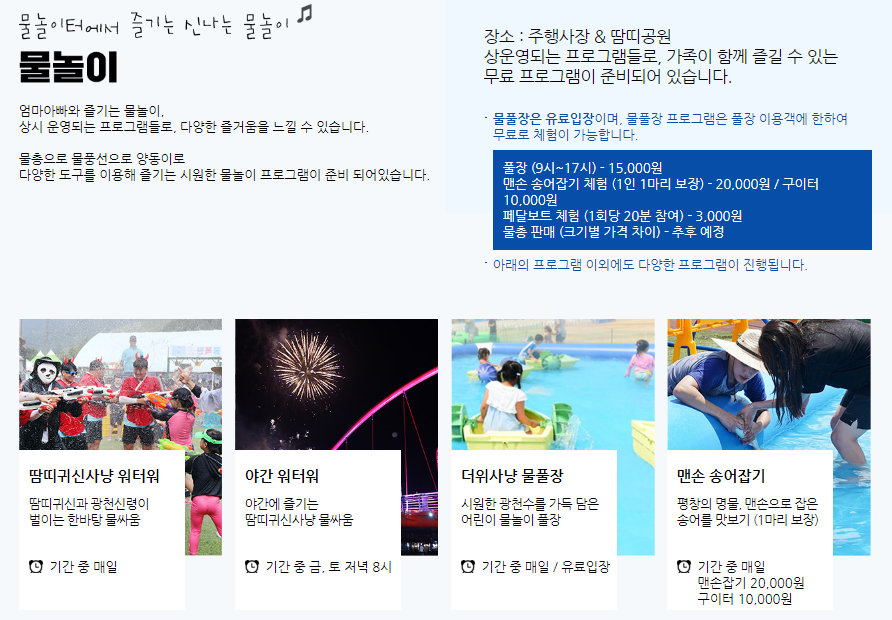 저녁에는 임경숙, 신경호, 초아밴드, 에버그린, 김휘랑 등의 공연이 있으며  야간 워터워도 진행이 됩니다.