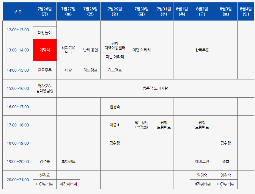 7월 26일 개막식을 시작으로 많은 공연들이 시간대별로 예정되어 있습니다.