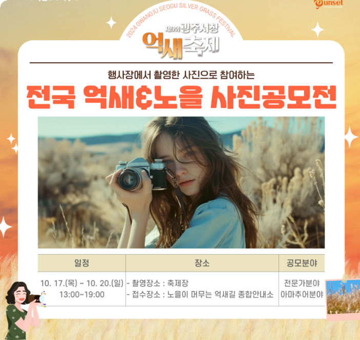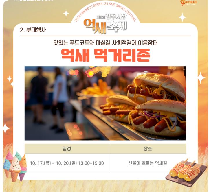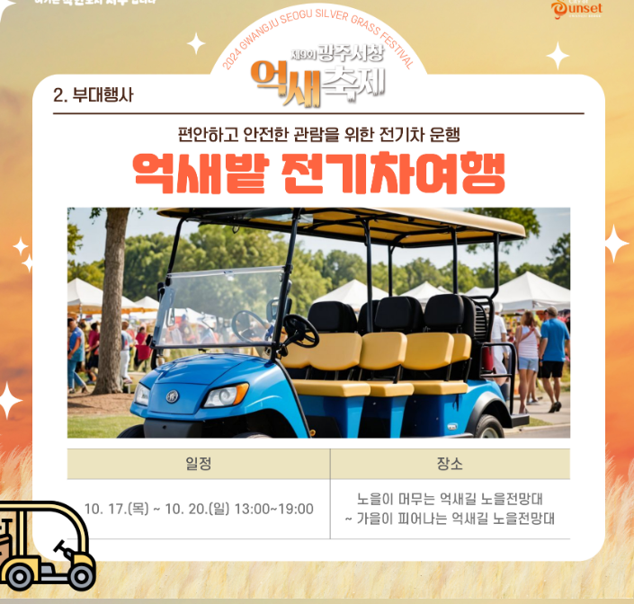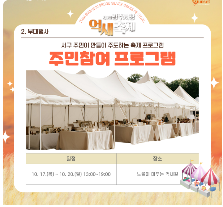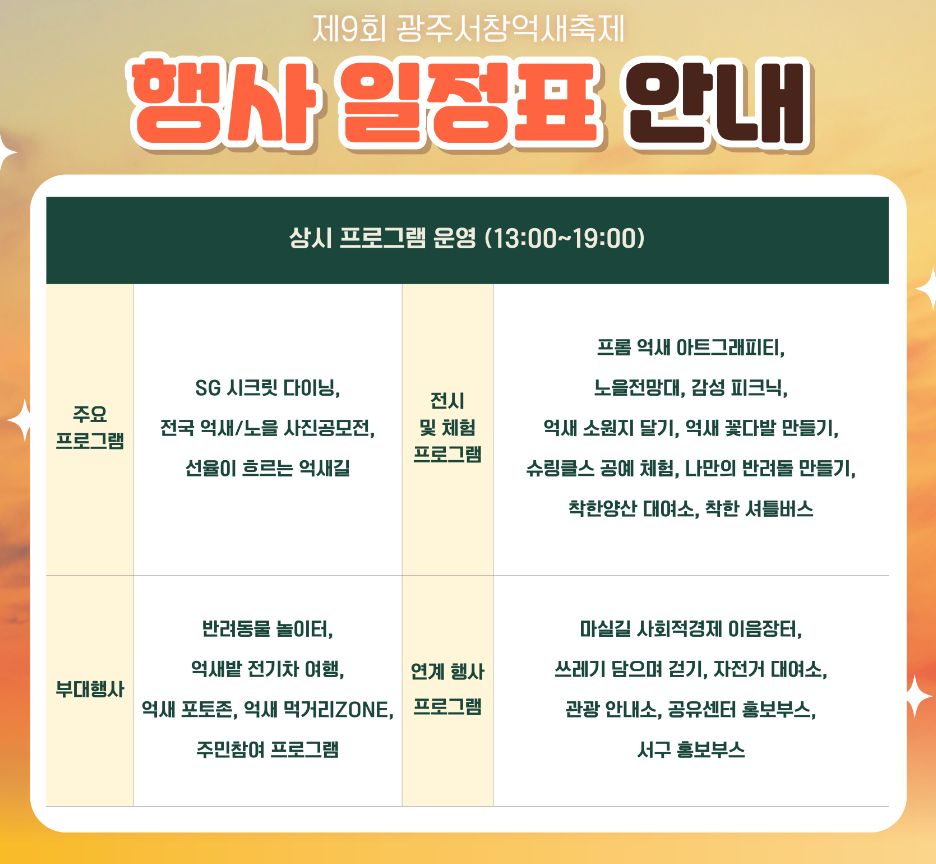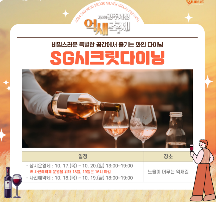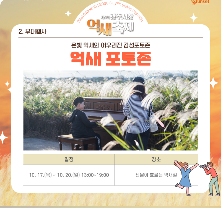 주요 프로그램으로는 SG 시크릿 다이닝, 전국 억새/노을 사진공모전, 선율이 흐르는 억새길, 서창억새 멍때리기 대회가 준비되어 있습니다.