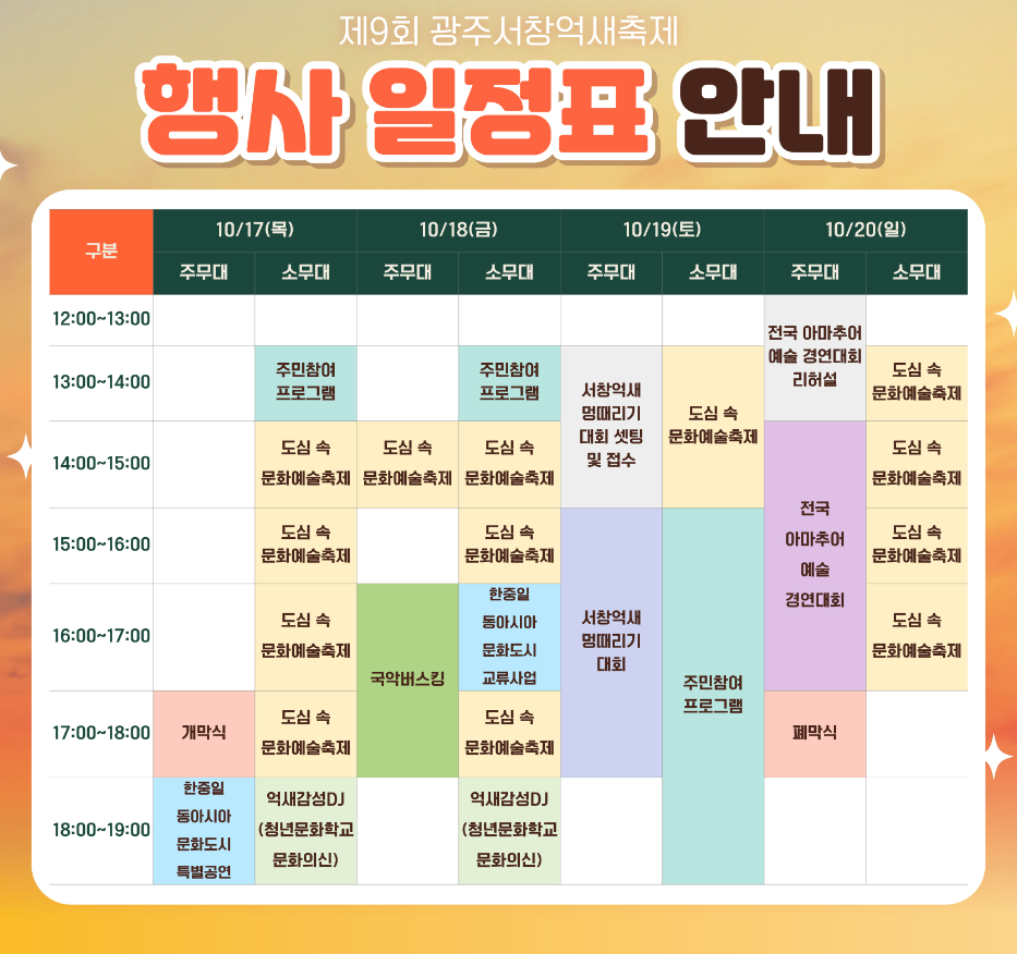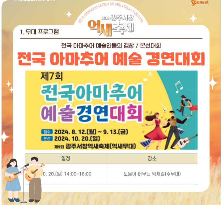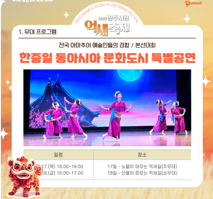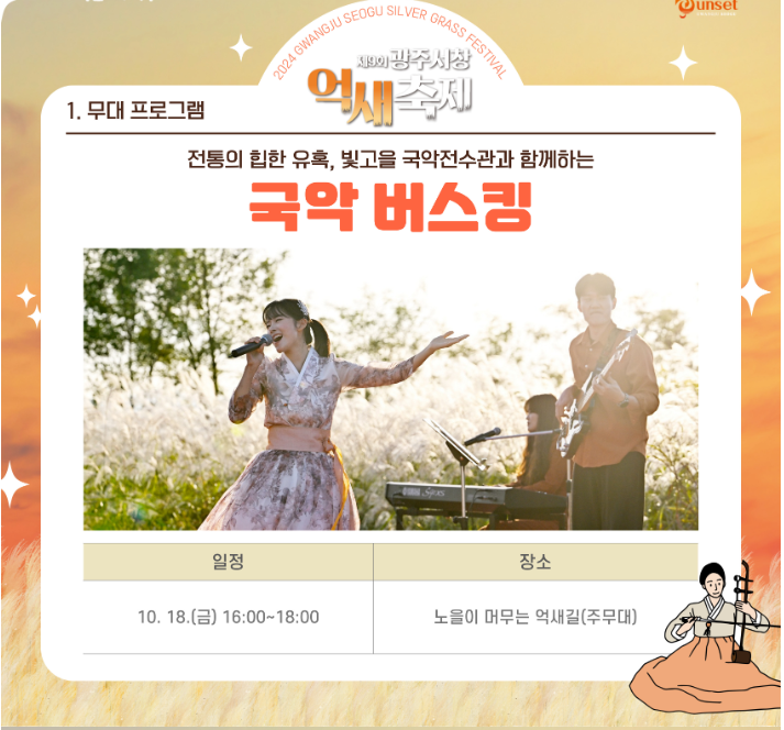 광주 서청억새축제 무대행사로는 전국 아마추어 예술경연대회, 국악버스킹, 한중일 동아시아 문화도시 특별공연이 예정되어 있습니다.
