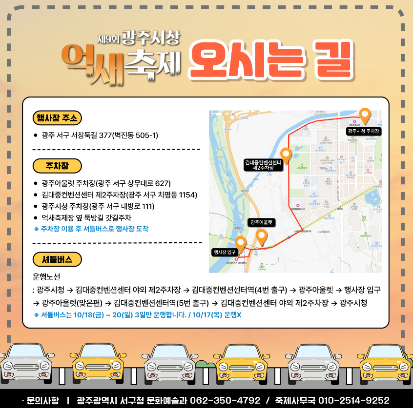 금요일부터 일요일까지는 광주 억세축제 뿐만아니라 김치축제도 진행기 되기때문에 교통이 혼잡할 것으로 예상이 됩니다.
