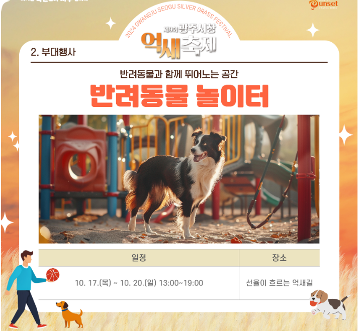 억새축제 부대행사로는 반려동물 놀이터, 억새밭 전기차 여행, 포토존, 먹거리존, 주민참여 프로그램이 예정되어 있습니다.