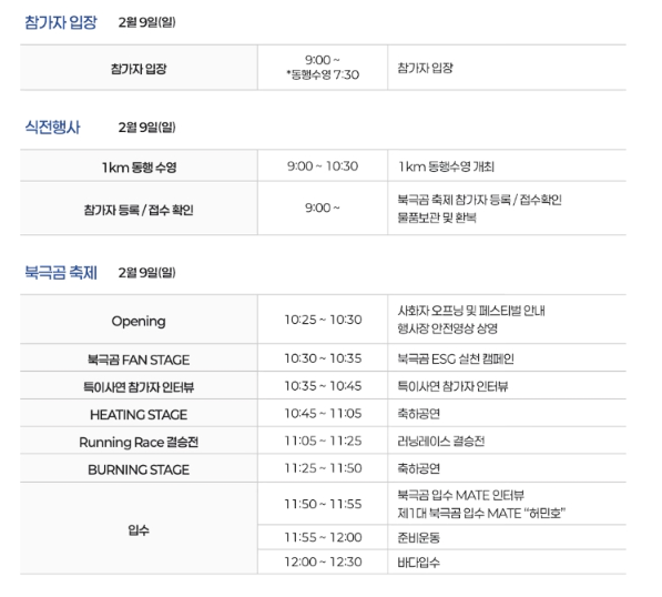 메인 프로그램으로는 1km 동행 수영대회와 입수식이 있습니다.