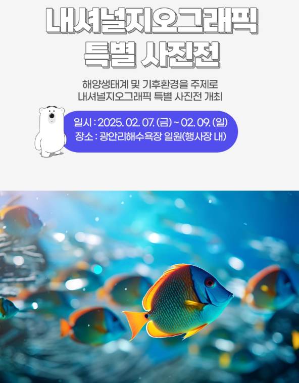 전시 프로그램으로는 해운대 북극곰 캐릭터 포토존, 북극곰 인증 포토존, 내셔널지오그래픽 특별 사진전이 준비되어 있습니다.