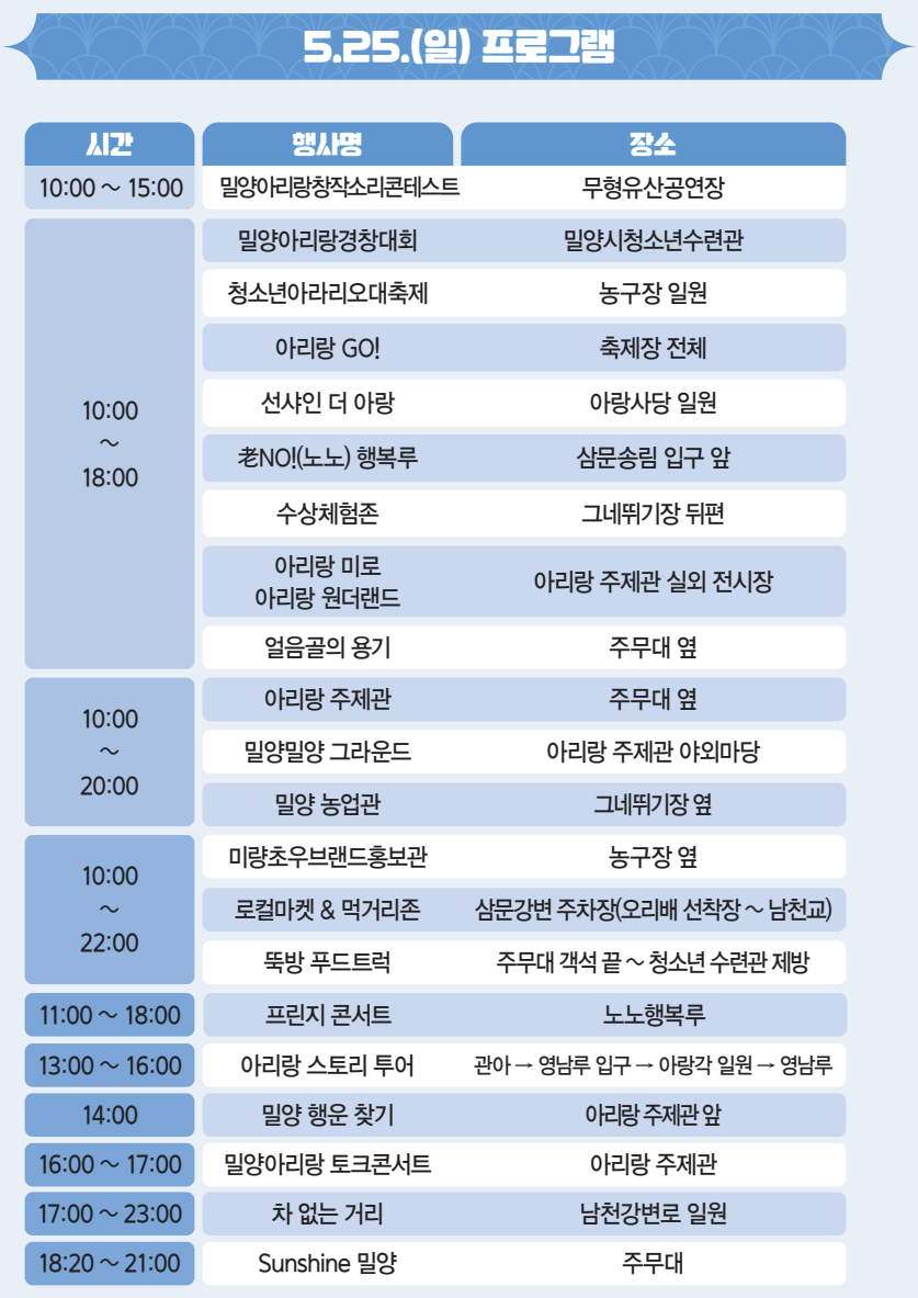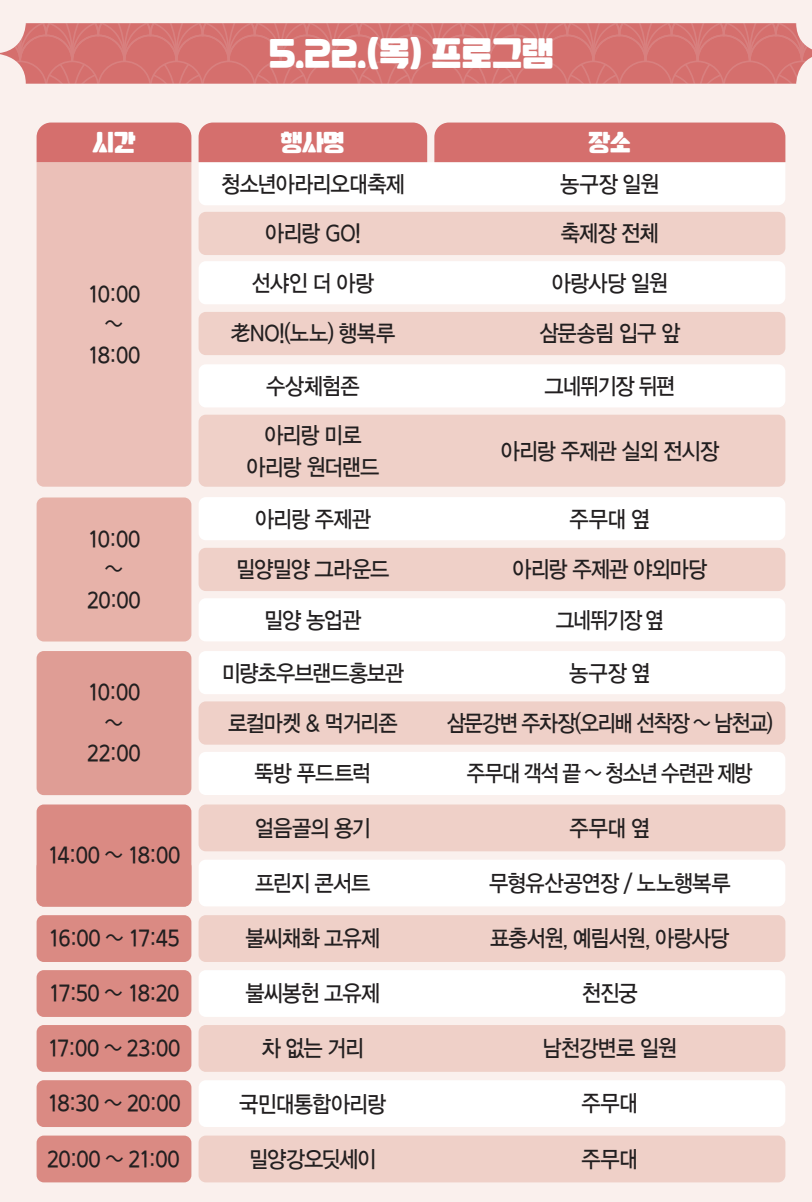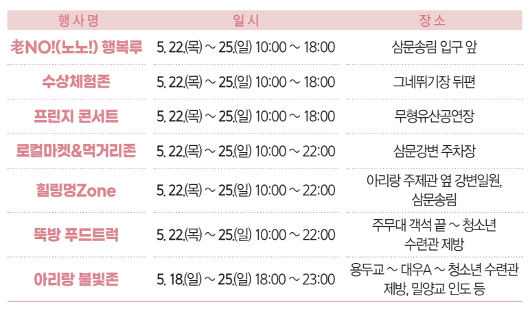 - 행사 장소 : 경상남도 밀양시 삼문동 1-1 영남루 및 밀양강변 일원