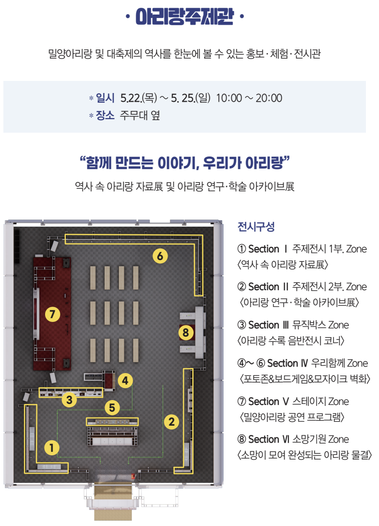 - 아리랑주제관 : 아리랑 및 대축제의 역사와 전세계에 퍼져있는 밀양아리랑 소개하는 전시체험 공간