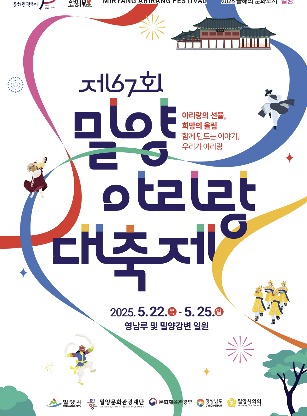 밀양 아리랑 대축제는 대표프로그램인 2025 밀양강오딧세이, 아리랑 주제관 및 주제형 프로그램이 진행 됩니다.