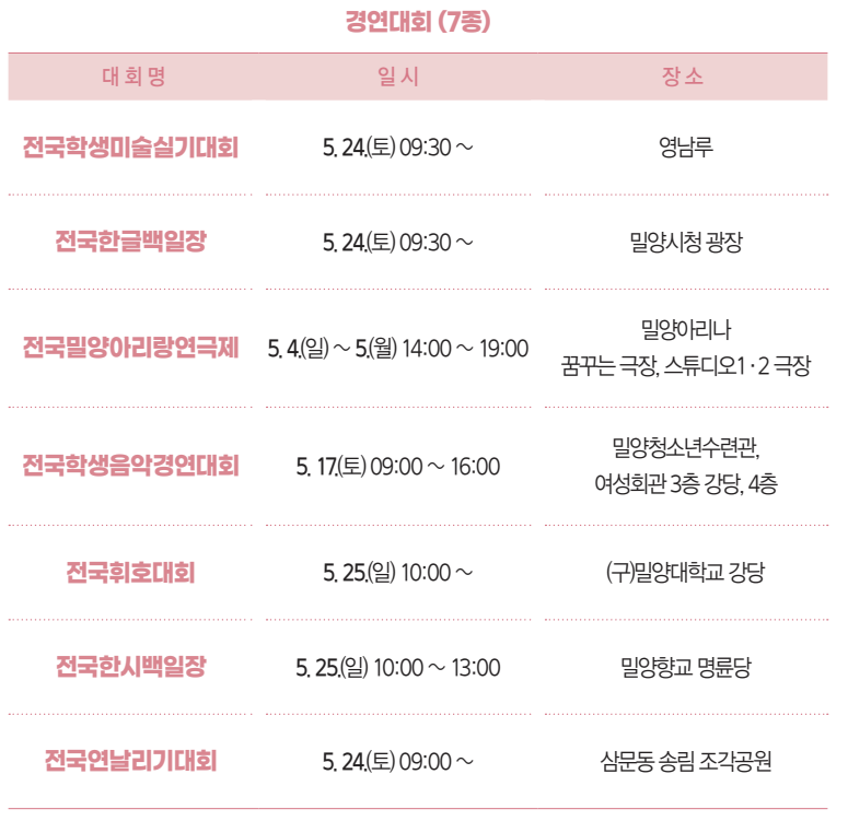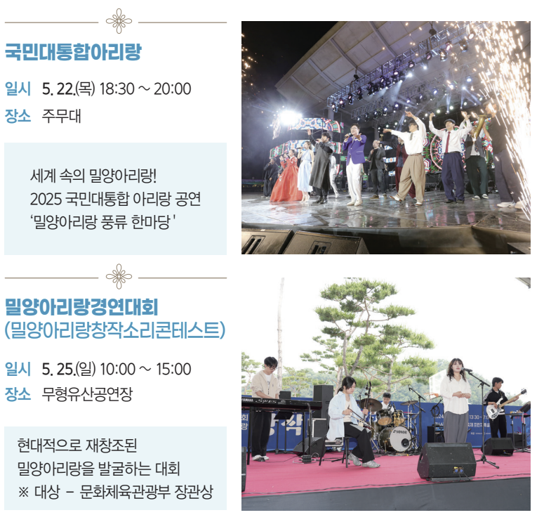 - 밀양아리랑경창대회 : 밀양아리랑 경창자 및 이수자를 발굴하는 경창경연대회