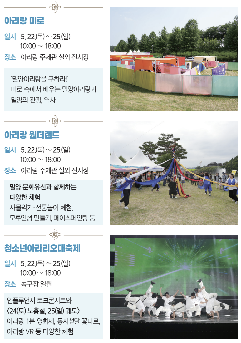- 아리랑 원더랜드 : 밀양의 무형유산과 오감체험 등 전 연령층 체험 콘텐츠