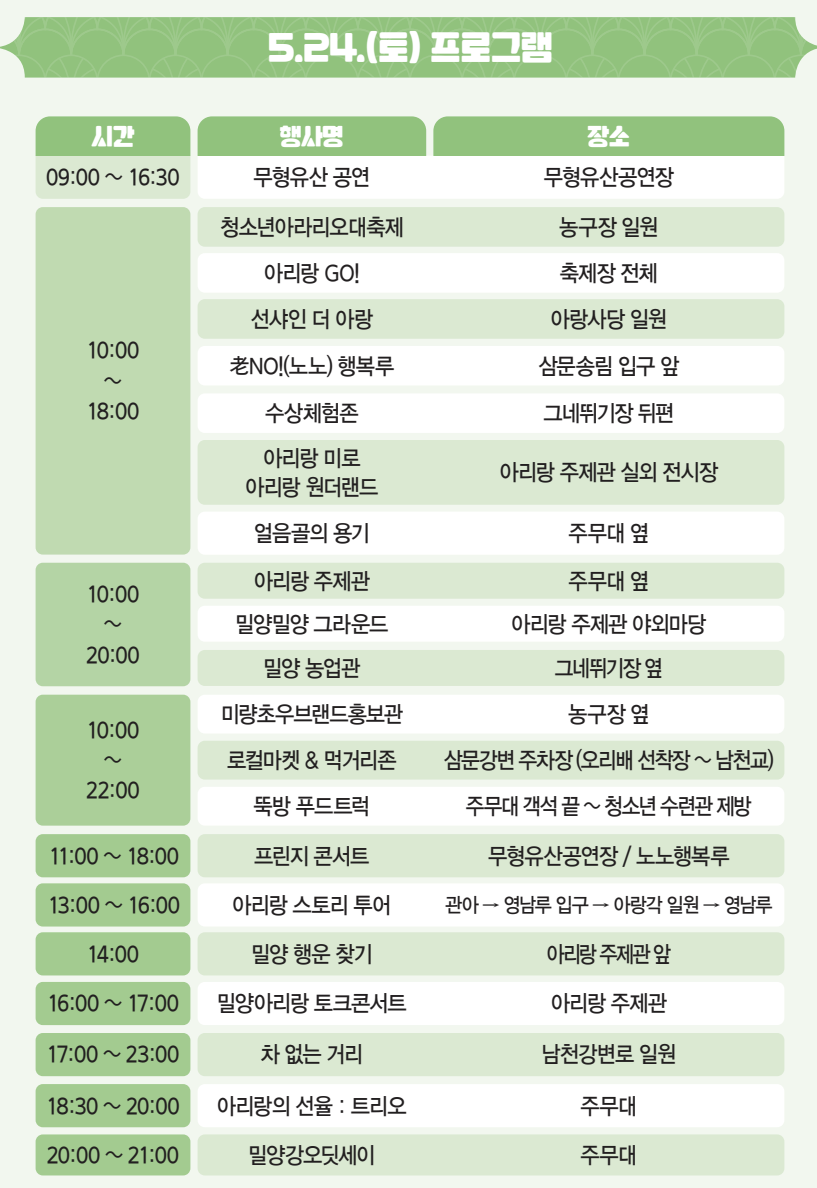 - 청소년아라리오축제 : 밀양의 청소년들이 직접 만드는 축제 속의 축제