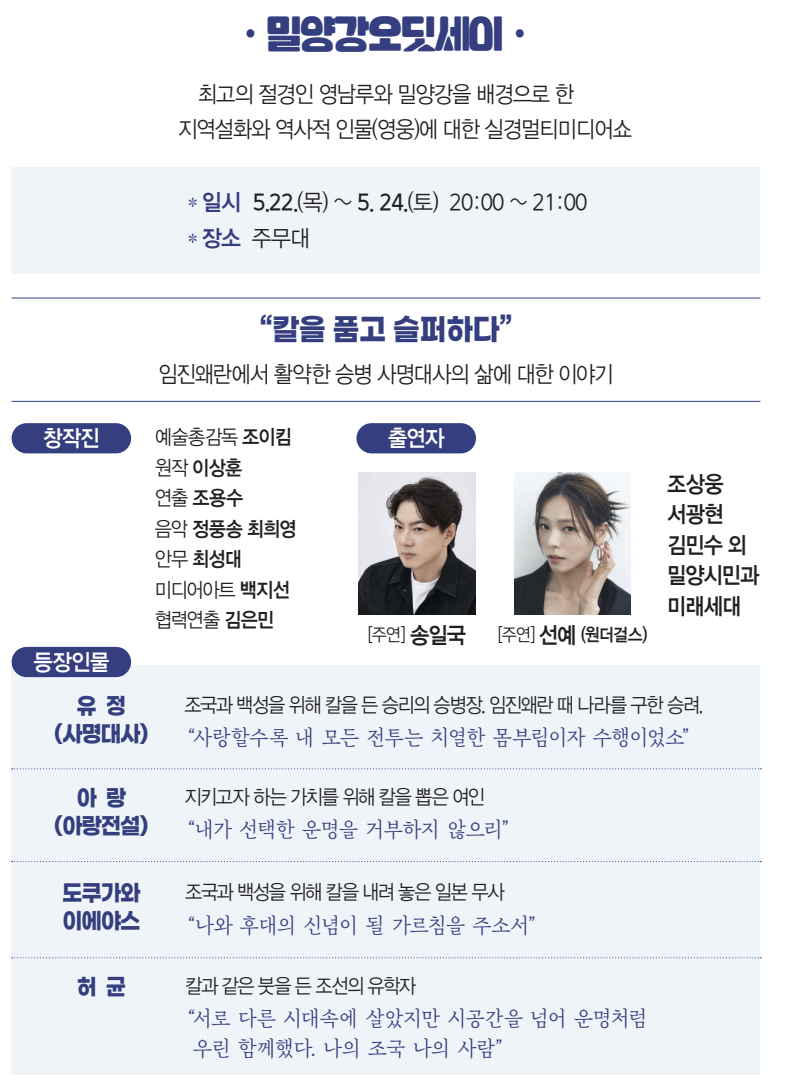 - 2025 밀양강오딧세이 : 밀양의 최고 절경인 영남루와 밀양강을 배경으로 펼쳐지는 실경멀티미디어 공연