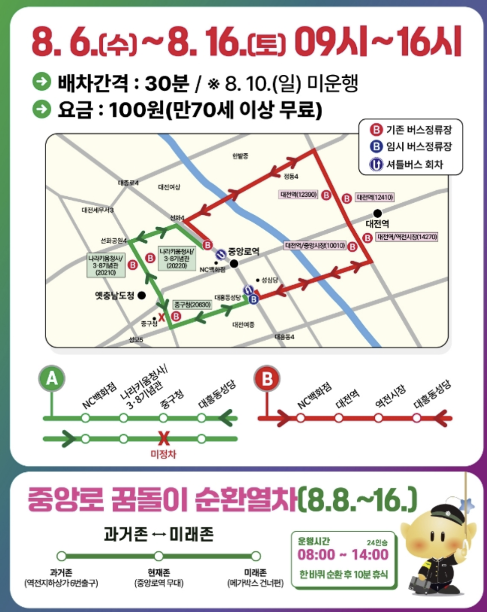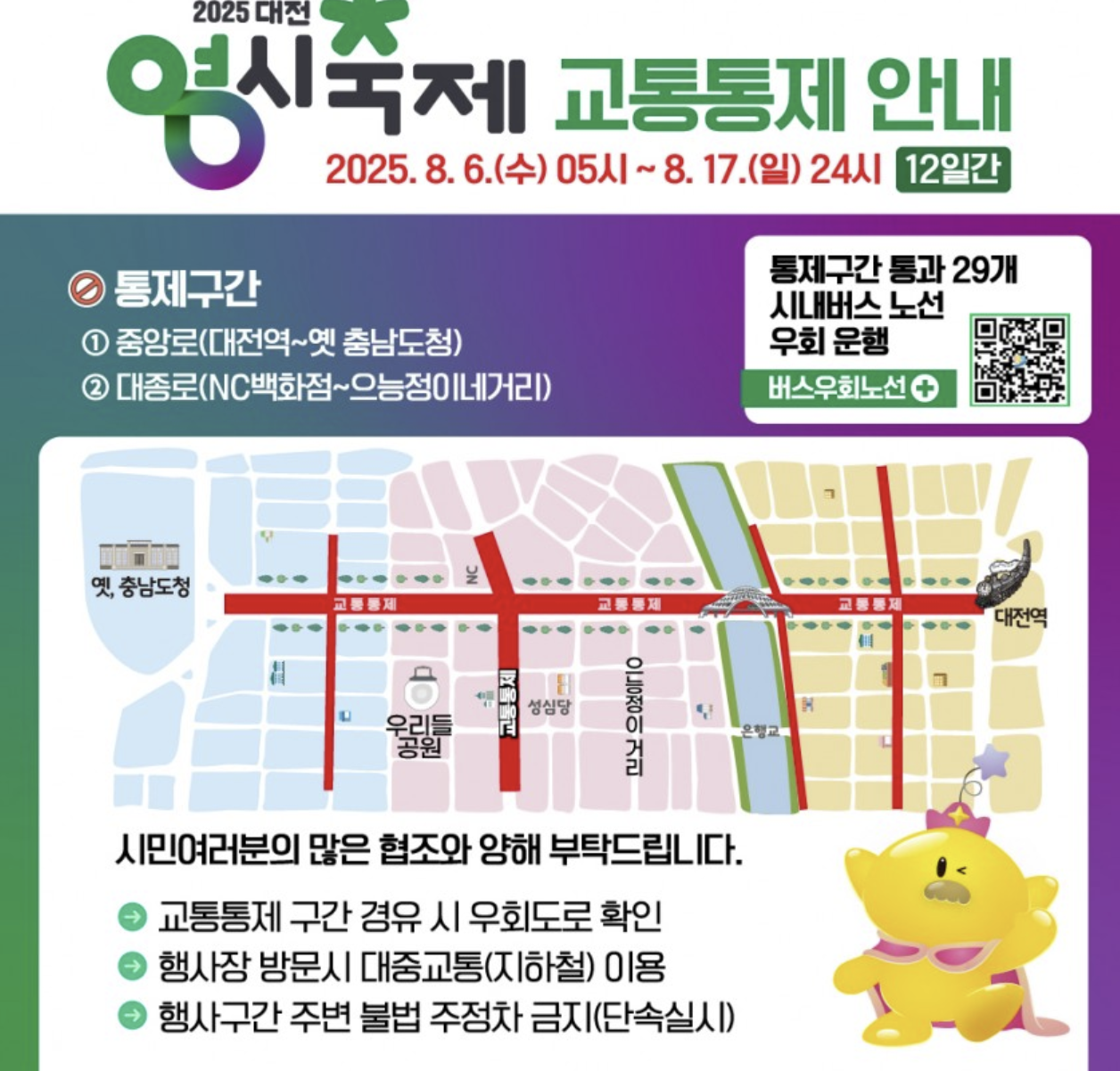축제기간 동안 대전역 ~ 옛 충남도청 구간과 NC백화점~ 으능정이네거리 구간은 교통이 동제되오니 참고하시고 이쪽길을 지나가셔야 한다면 우회하시기를 추천드립니다.