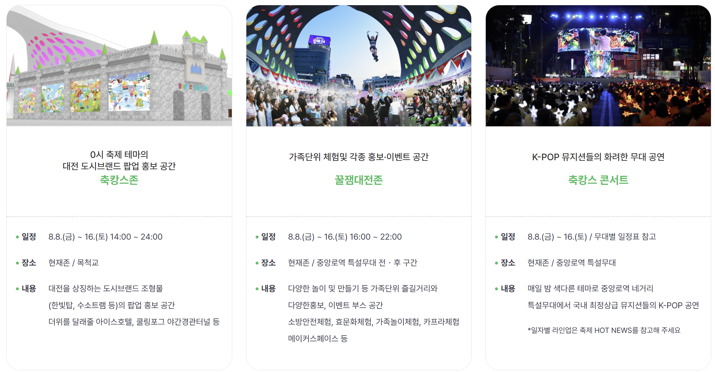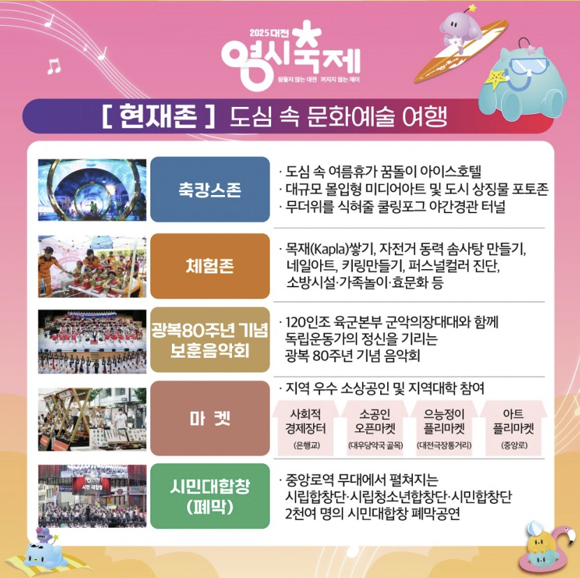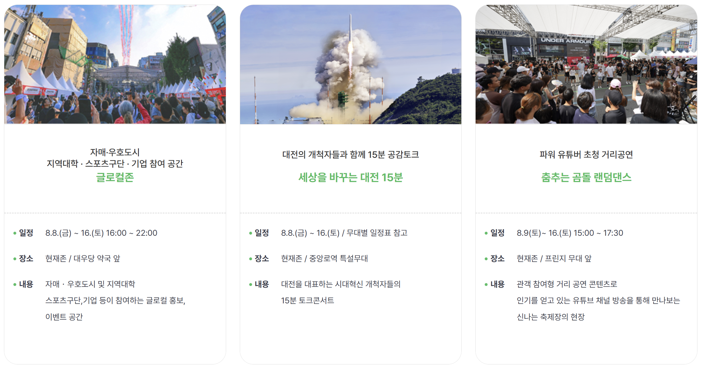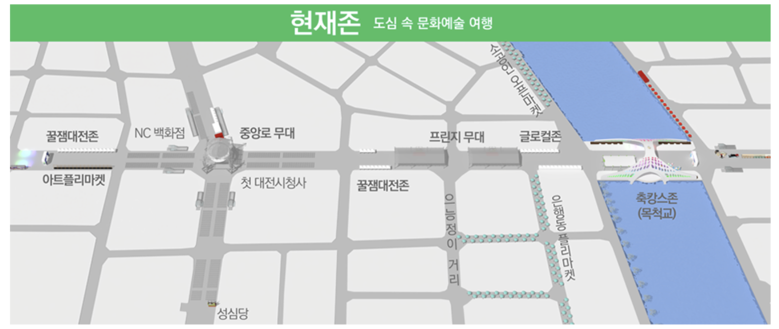 현재존에는 축캉스존, 꿀잼대전존, 축캉스 콘서트, 글로컬 존, 세상을 바꾸는 대전 15분, 유튜브 춤추는 곰돌 랜덤댄스 등이 준비되어 있습니다.
