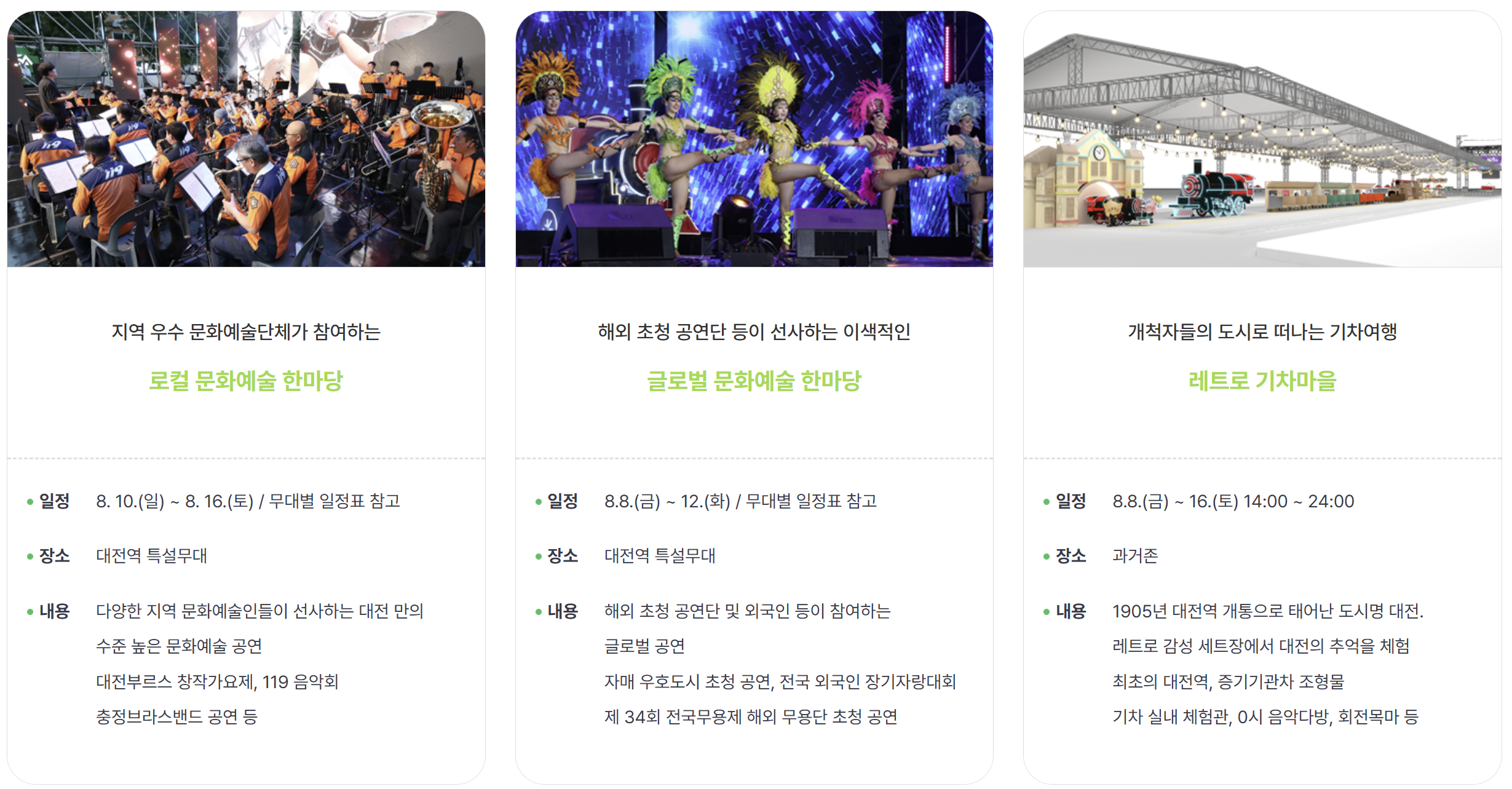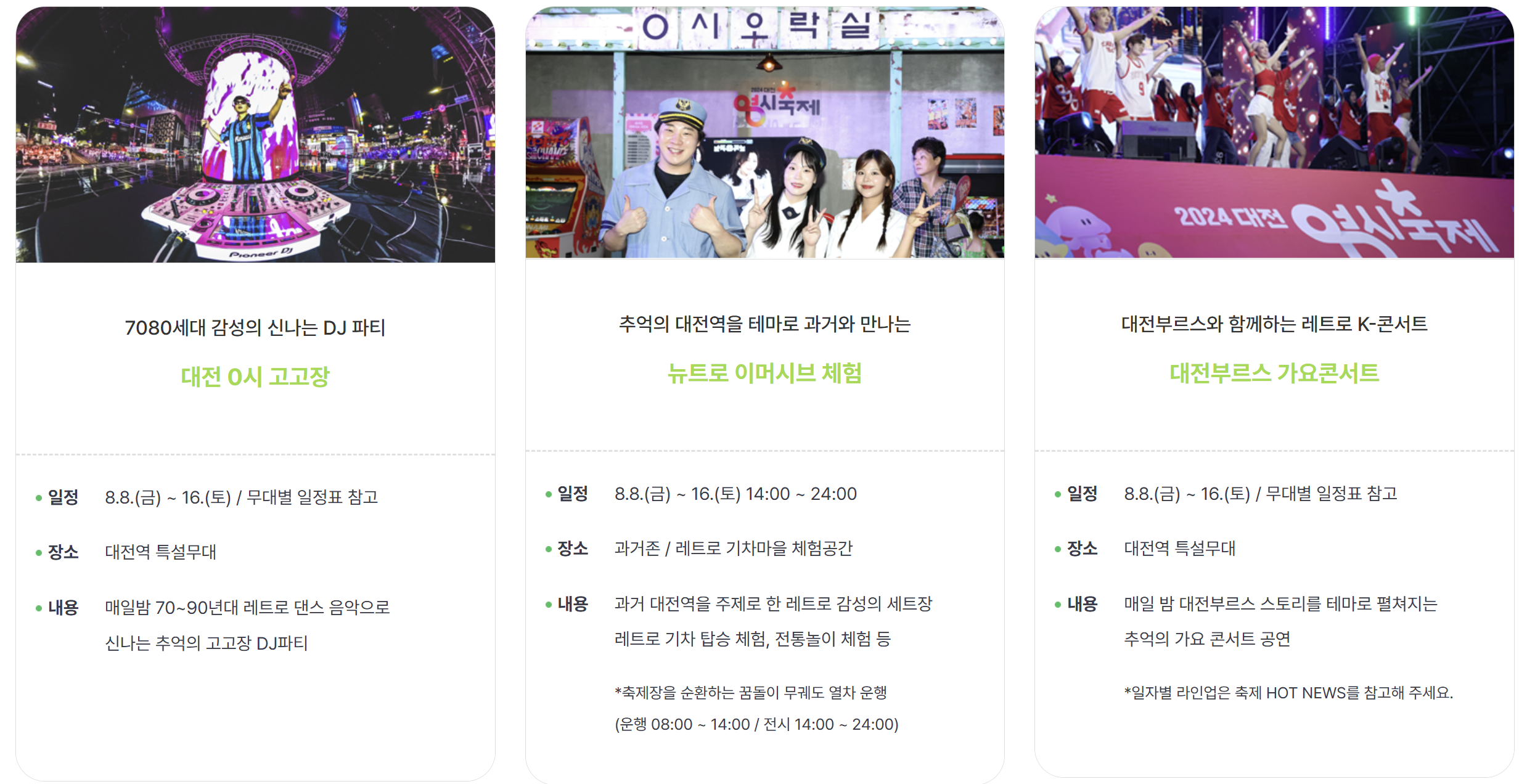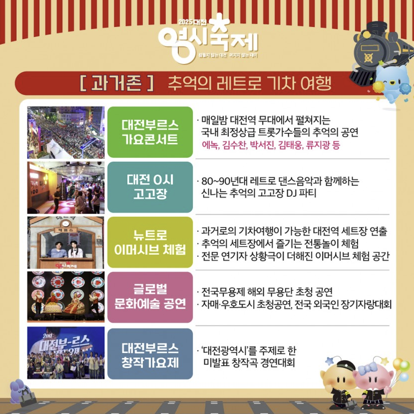 대전 0시 고고장, 뉴트로 이머시브체험, 대전부르스 가요콘서트, 로컬 문화예술 한마당, 글로벌 문화예술 한마당, 레트로 기차마을 등에 참여하실 수 있습니다.