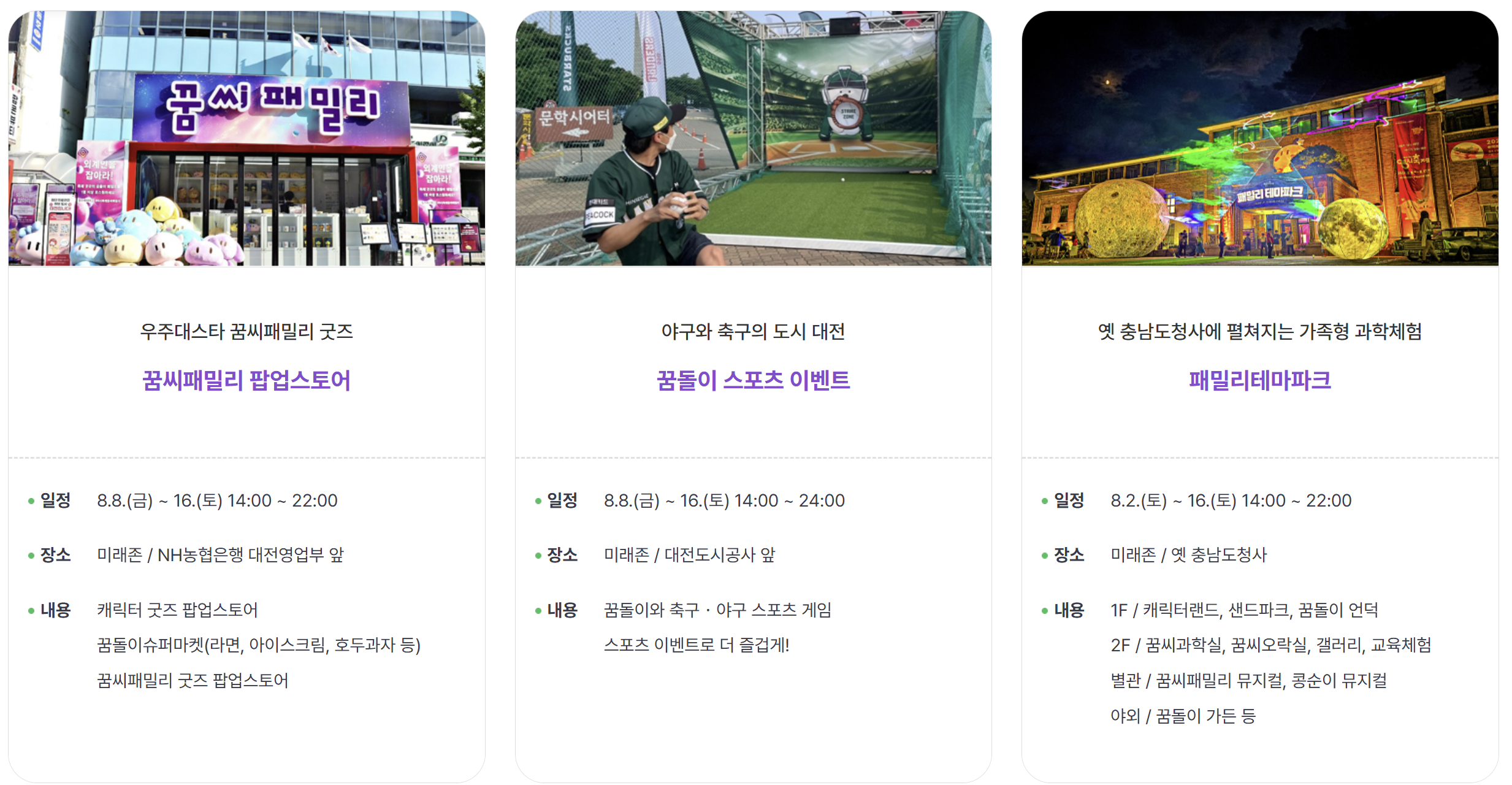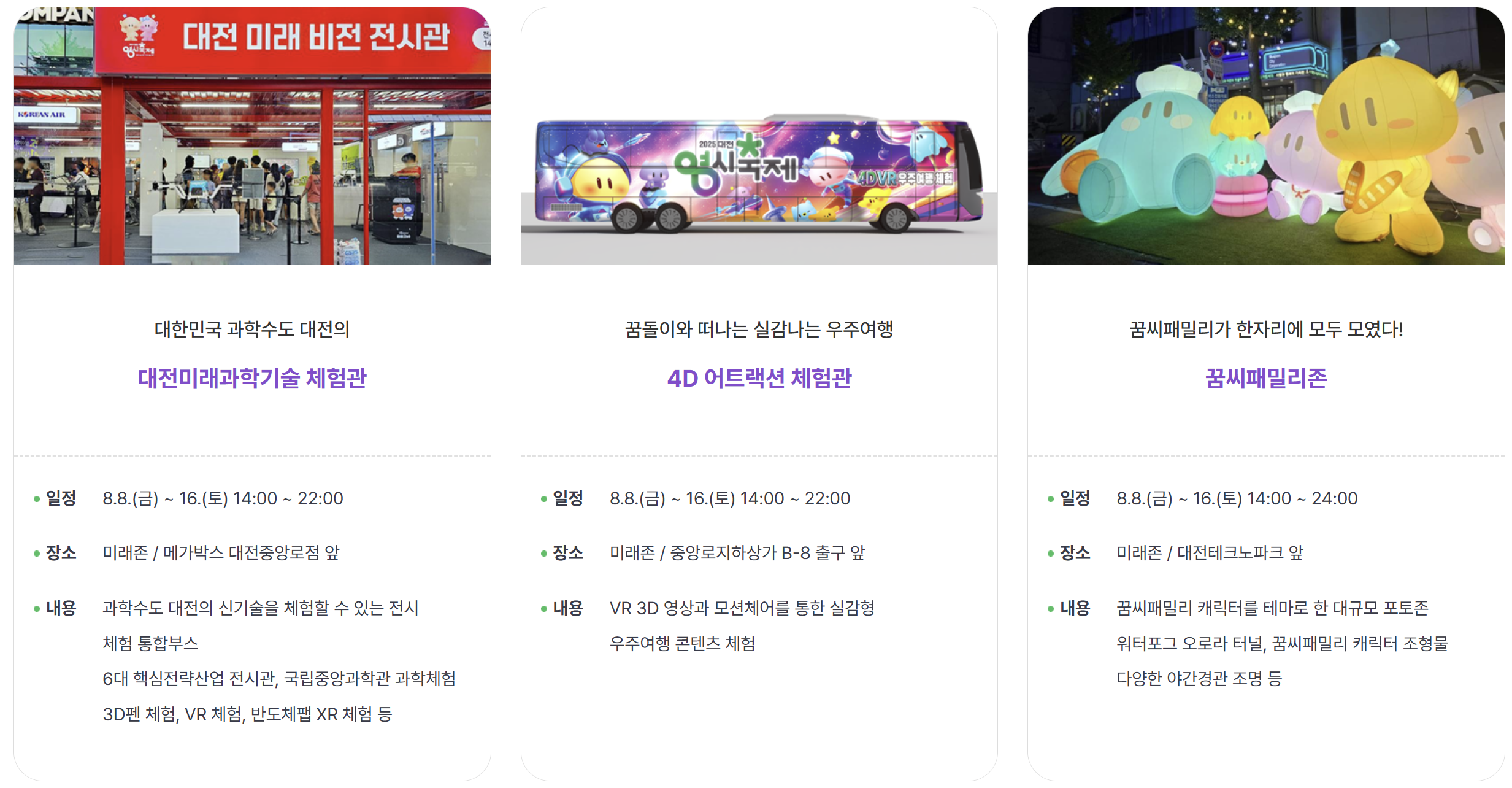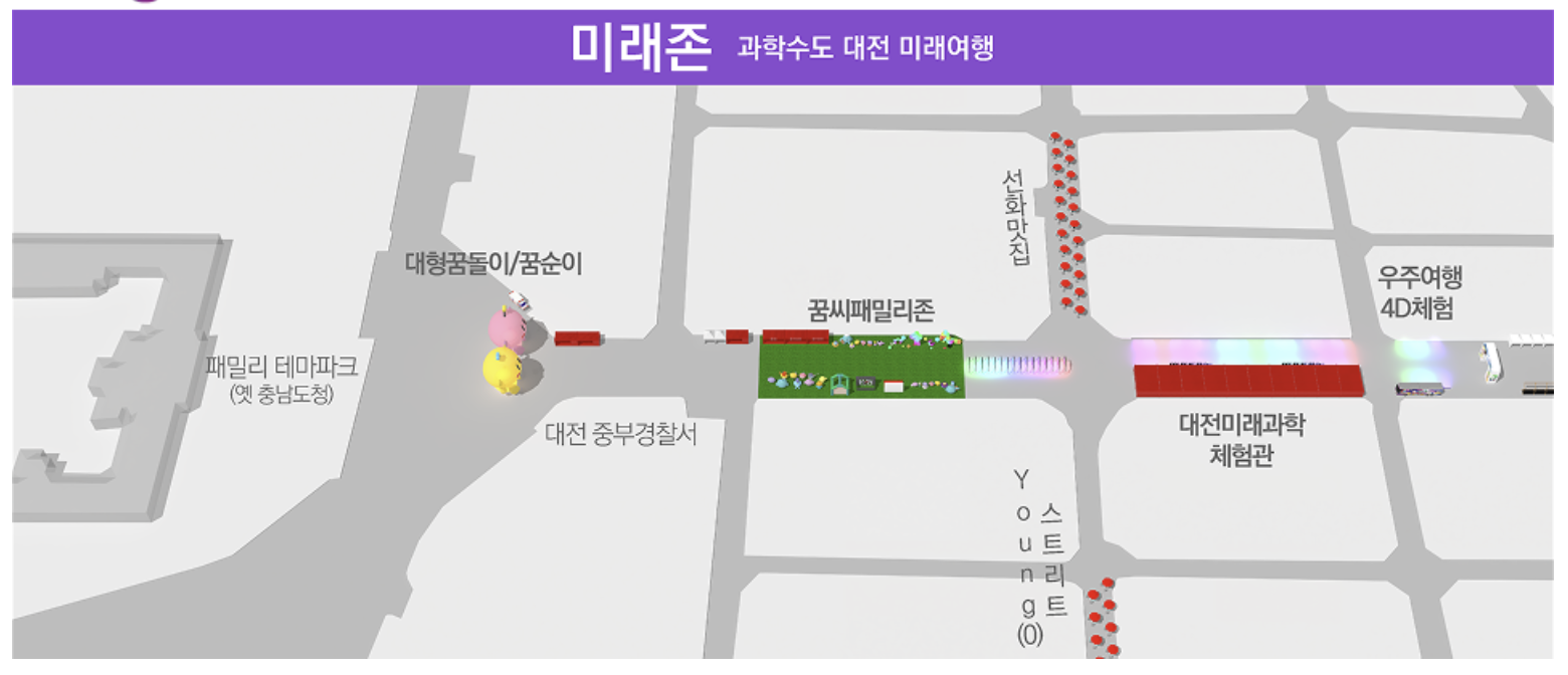 미래존에서는 대전미래과학기술 체험관, 4D 어트랙션 체험관, 꿈씨패밀리존, 꿈씨패밀리 팝업스토어, 꿈돌이 스포츠 이벤트, 패밀리테마파크 체험이 가능합니다.