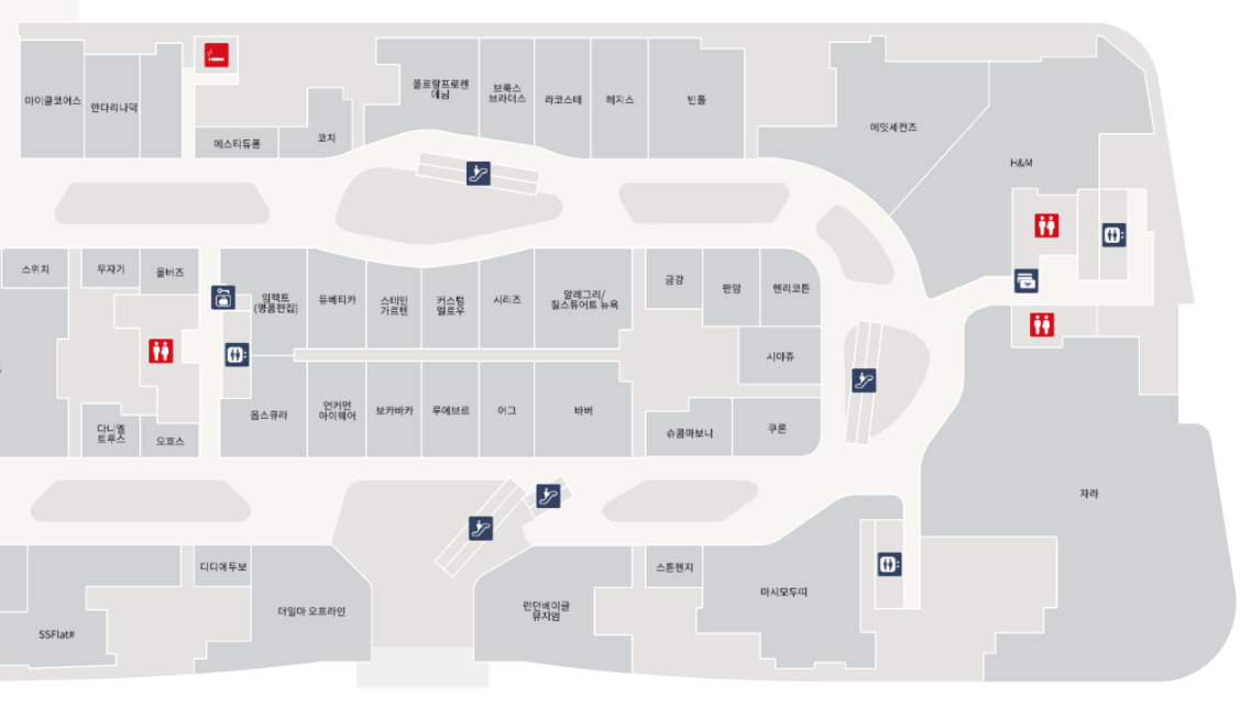 - 패션의류 : COS, H&M, LCDC, 더일마, 듀베티카, 라코스테, 루에브르, 마시모두띠, 마이클코어스, 만다리나덕, 바버, 보카바카, 브룩스 브라더스, 빈폴 복합관, 스테인가르텐, 시리즈, 시야쥬, 아르켓, 알레그리, 에스에스플랫샵, 에잇세컨즈, 오호스, 올버스, 옵스큐라, 자라, 질스튜어트 남성, 커스텀멜로우, 코치, 팬암, 폴로 데님, 헤지스, 헨리코튼
