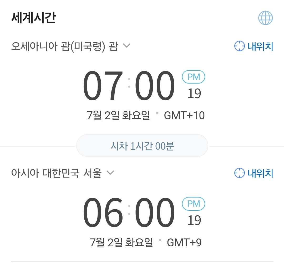 괌은 한국보다 1시간이 빠릅니다. 반대로 괌은 한국보다 1시간이 느립니다. 한국이 7월 2일 오후 6시라면 괌은 오후 7시 입니다.